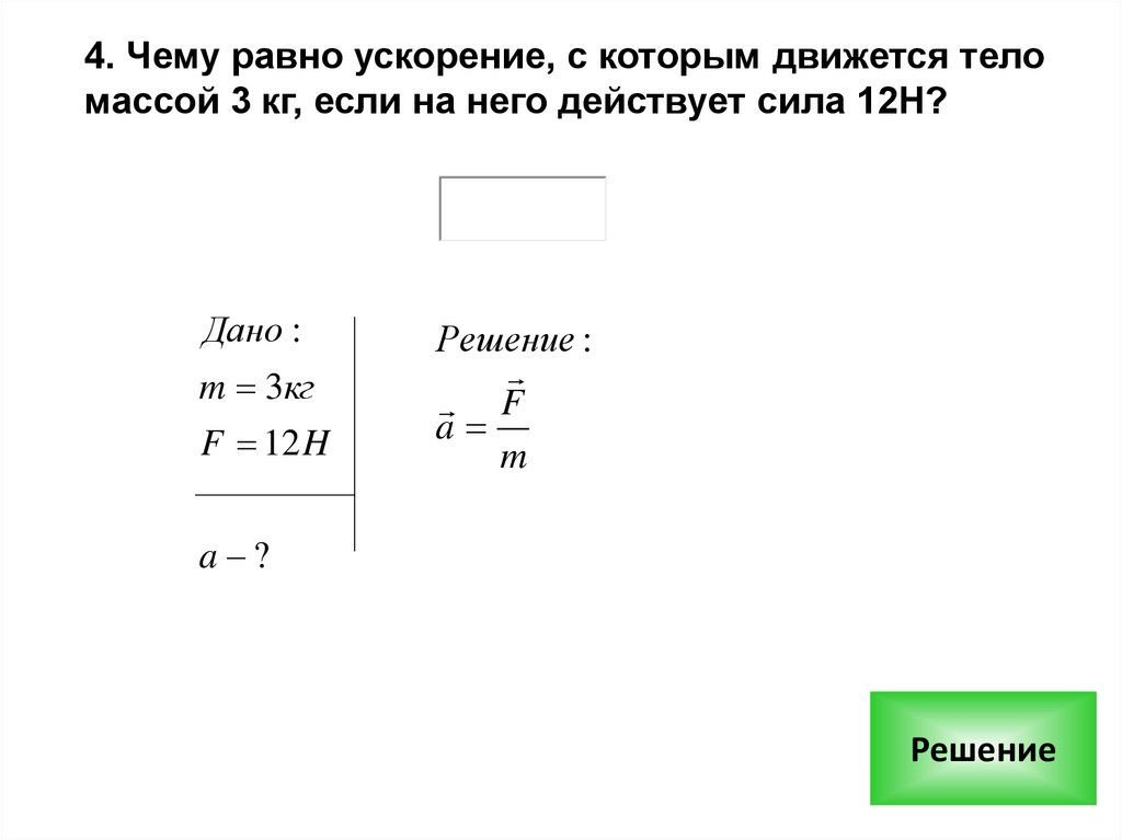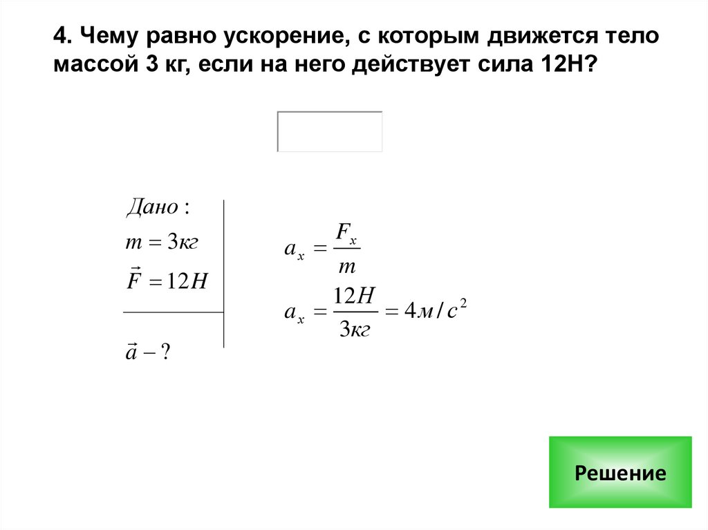 4. Чему равно ускорение, с которым движется теломассой 3 кг, если на него действует сила 12Н?