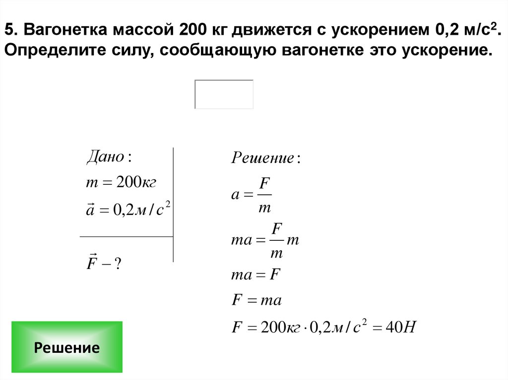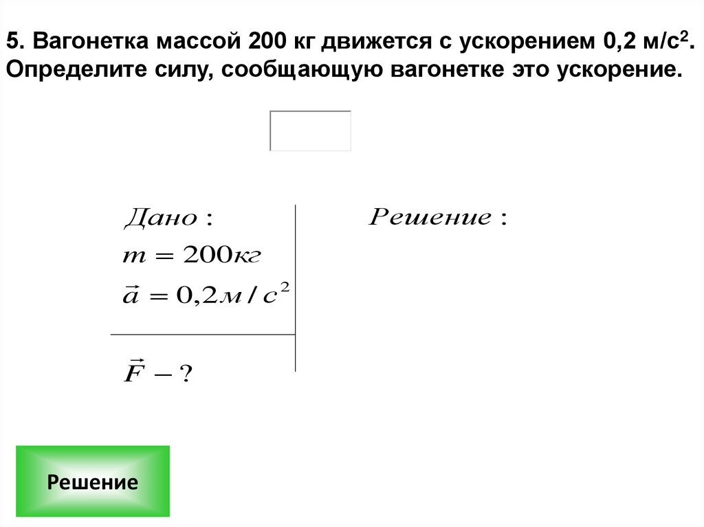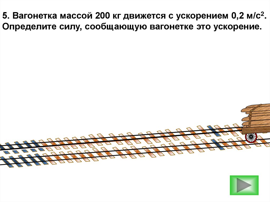 5. Вагонетка массой 200 кг движется с ускорением 0,2 м/с2.Определите силу, сообщающую вагонетке это ускорение.