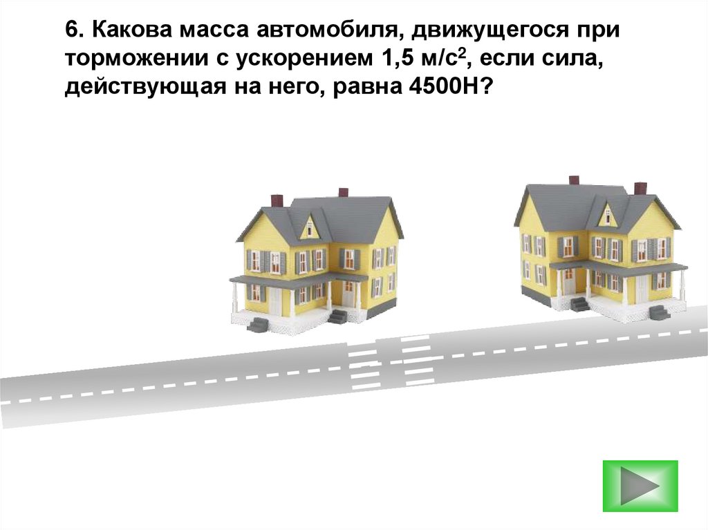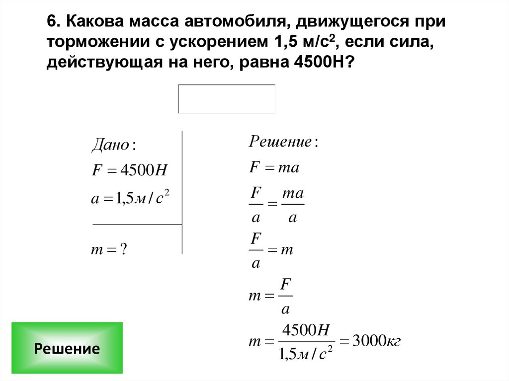 6. Какова масса автомобиля, движущегося приторможении с ускорением 1,5 м/с2, если сила,