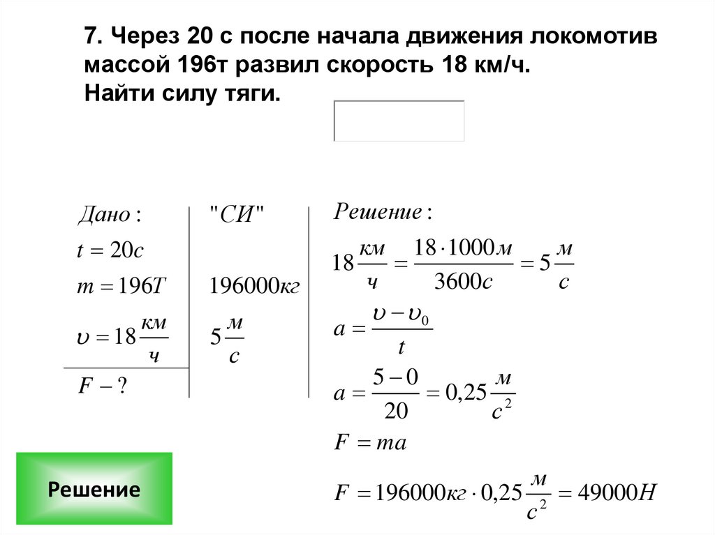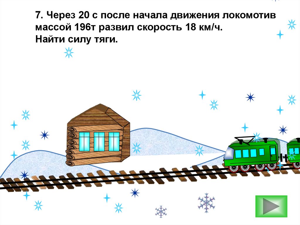 7. Через 20 с после начала движения локомотивмассой 196т развил скорость 18 км/ч.