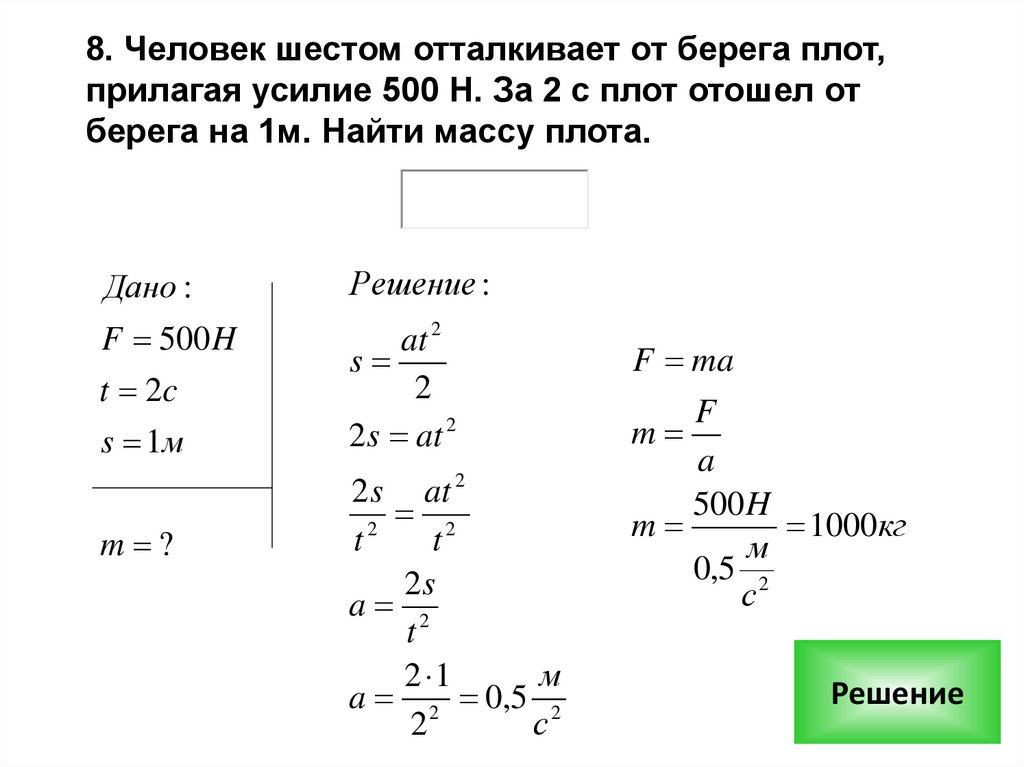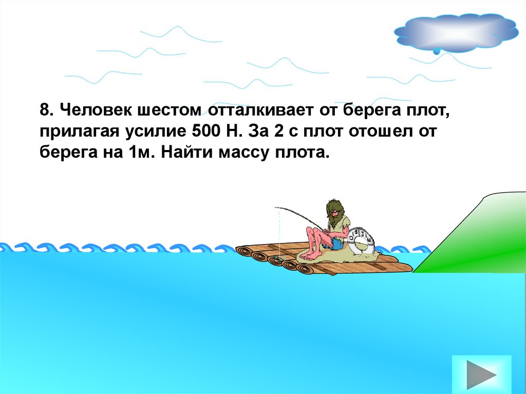 8. Человек шестом отталкивает от берега плот,прилагая усилие 500 Н. За 2 с плот отошел от