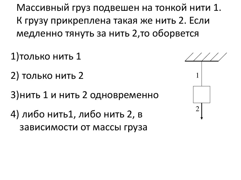Массивный груз подвешен на тонкой нити 1.К грузу прикреплена такая же нить 2. Если