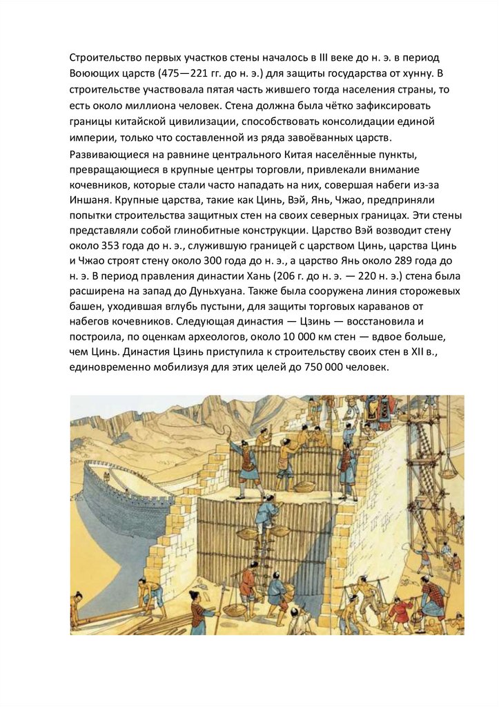 Строительство первых участков стены началось в III веке до н. э. в периодВоюющих царств (475—221 гг. до н. э.) для защиты государства от хунну. В
