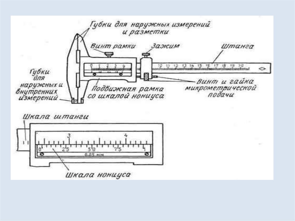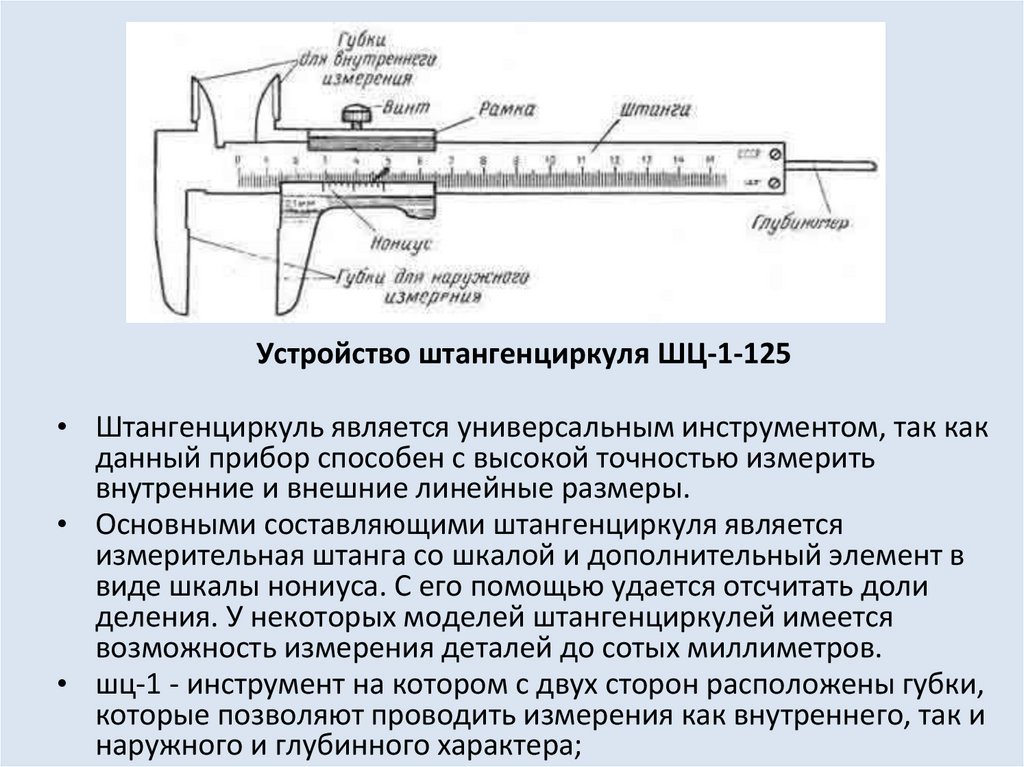 Устройство штангенциркуля ШЦ-1-125• Штангенциркуль является универсальным инструментом, так как