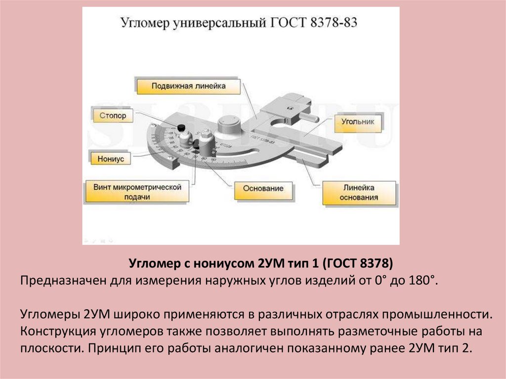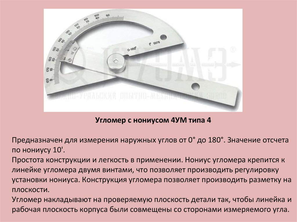 Угломер с нониусом 2УМ тип 1 (ГОСТ 8378)Предназначен для измерения наружных углов изделий от 0° до 180°.