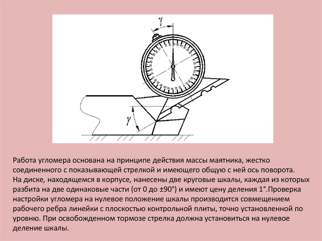 Работа угломера основана на принципе действия массы маятника, жесткосоединенного с показывающей стрелкой и имеющего общую с ней ось поворота.