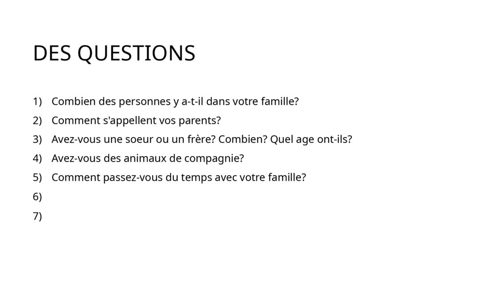 DES QUESTIONS1) Combien des personnes y a-t-il dans votre famille?