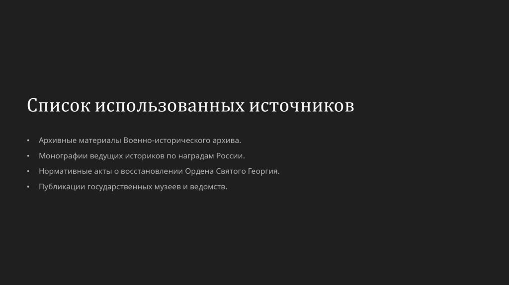 Список использованных источниковАрхивные материалы Военно-исторического архива.