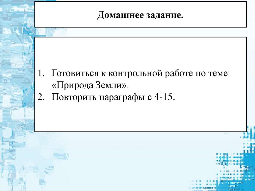 Домашнее задание.1. Готовиться к контрольной работе по теме: