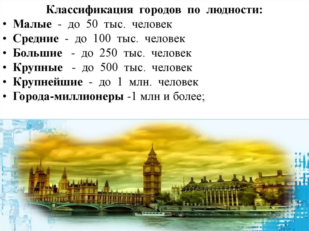 Классификация городов по людности:• Малые - до 50 тыс. человек