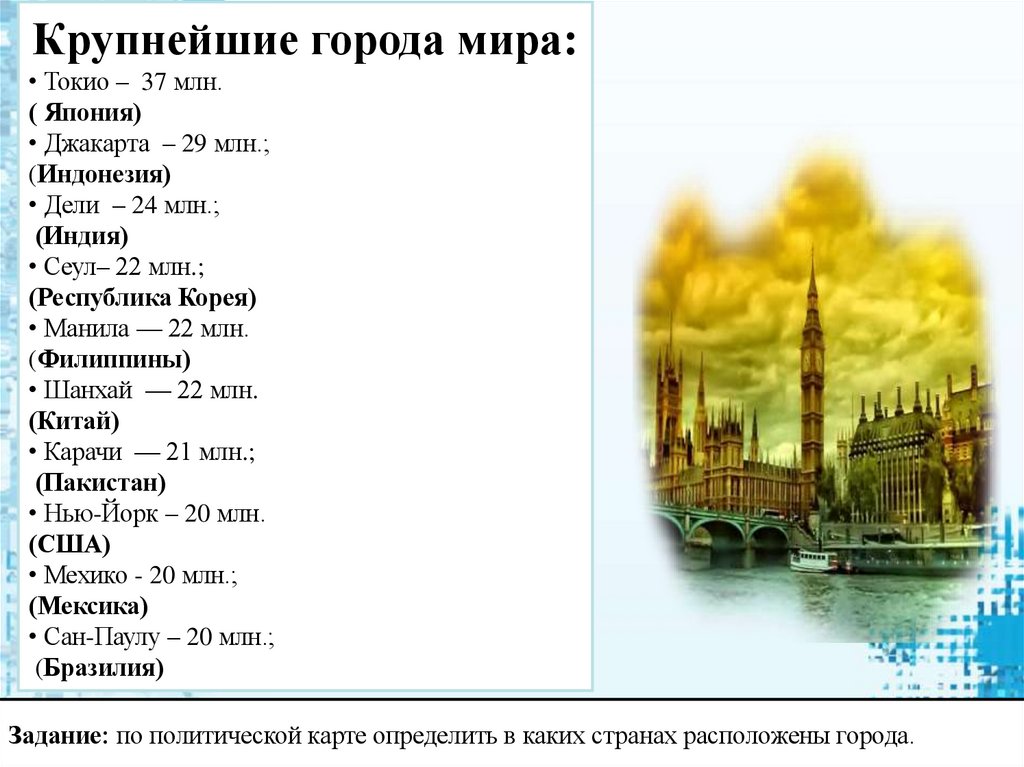 Крупнейшие города мира:• Токио – 37 млн.