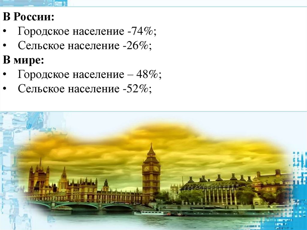 В России:• Городское население -74%;