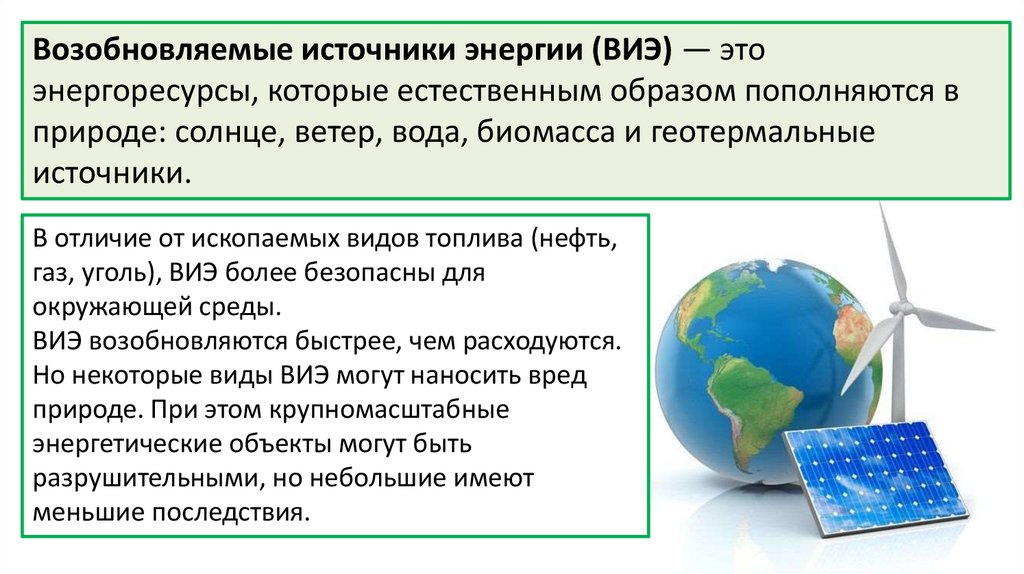 Возобновляемые источники энергии (ВИЭ) — этоэнергоресурсы, которые естественным образом пополняются в