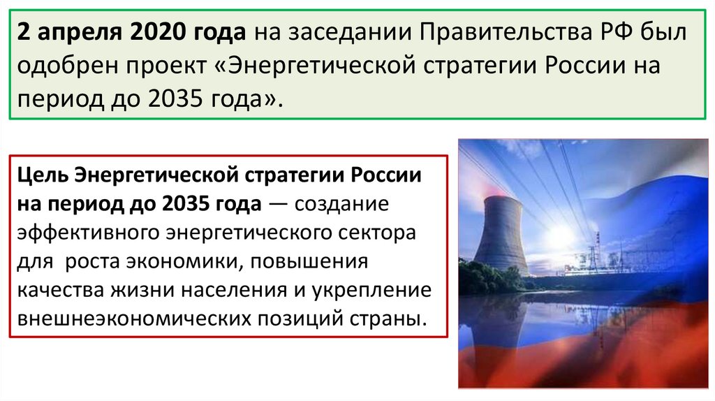 2 апреля 2020 года на заседании Правительства РФ былодобрен проект «Энергетической стратегии России на