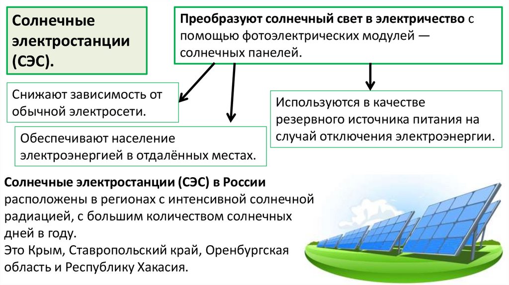 Электростанции, использующие возобновляемые источникиэнергии (ВИЭ), включают разные виды: солнечные (СЭС),