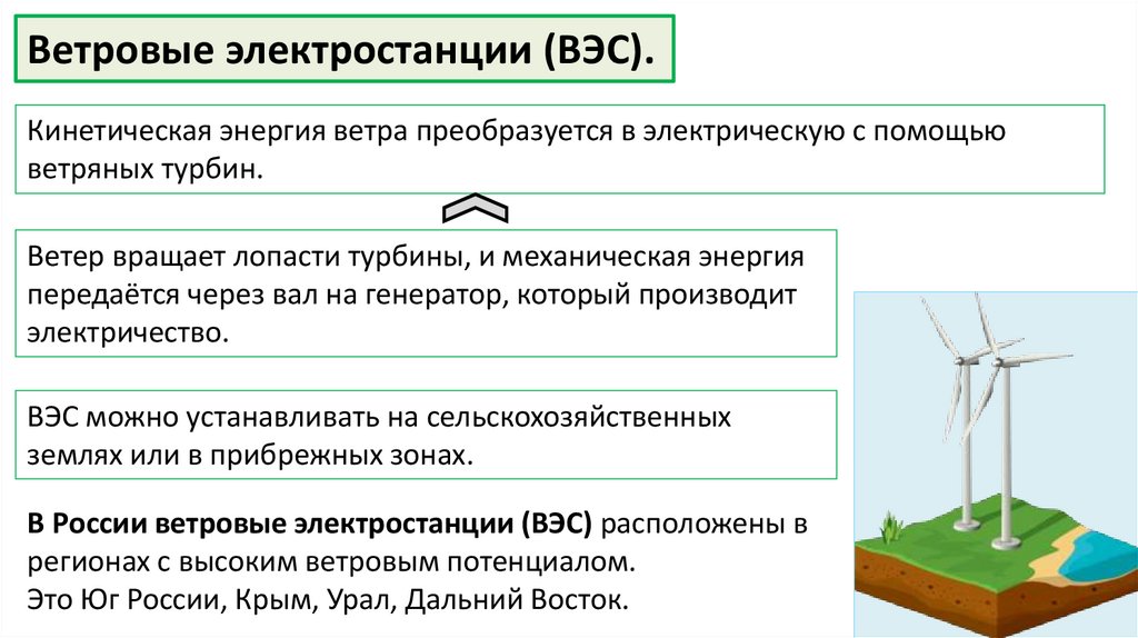 Ветровые электростанции (ВЭС).Кинетическая энергия ветра преобразуется в электрическую с помощью