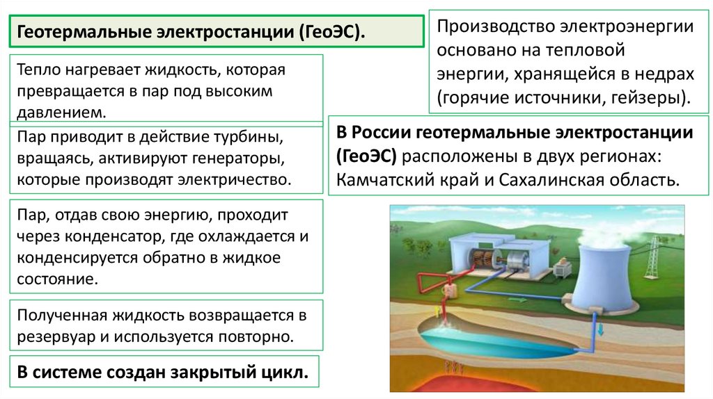 Геотермальные электростанции (ГеоЭС).Тепло нагревает жидкость, которая