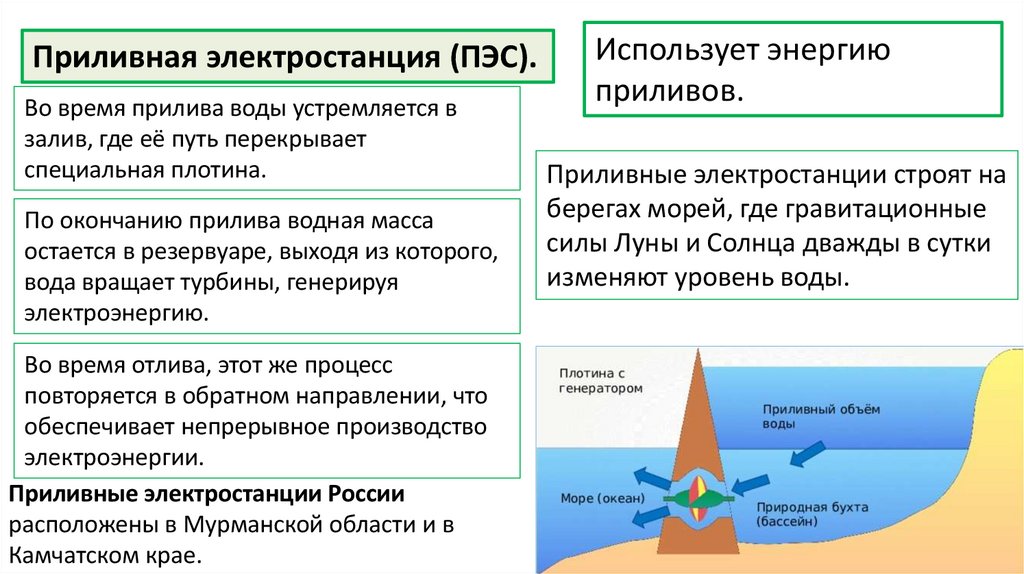 Приливная электростанция (ПЭС).Во время прилива воды устремляется в