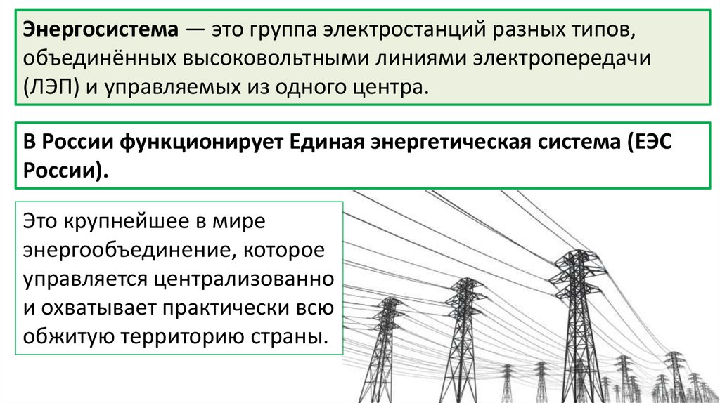 Энергосистема — это группа электростанций разных типов,объединённых высоковольтными линиями электропередачи