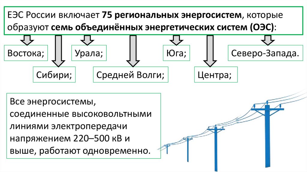 ЕЭС России включает 75 региональных энергосистем, которыеобразуют семь объединённых энергетических систем (ОЭС):