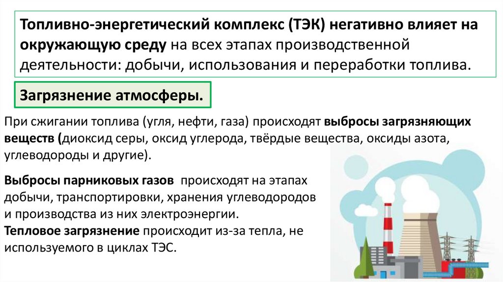 Топливно-энергетический комплекс (ТЭК) негативно влияет наокружающую среду на всех этапах производственной