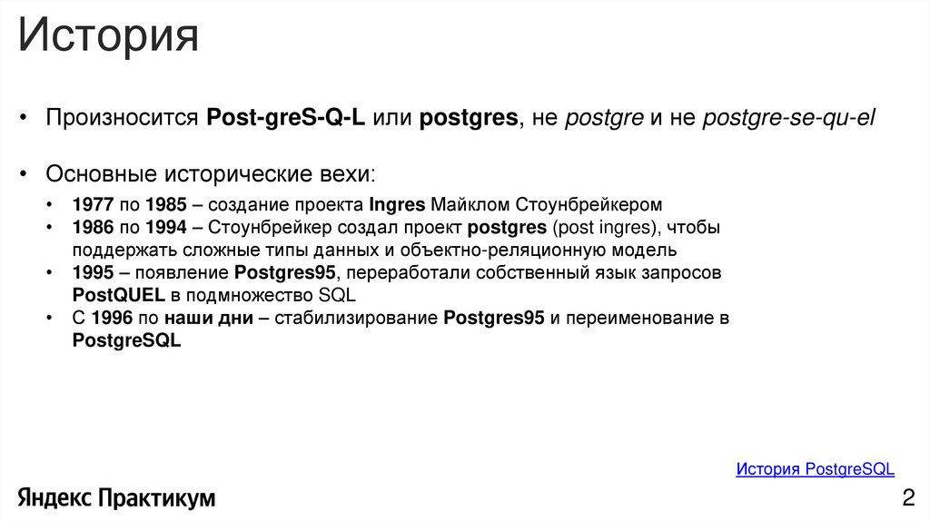 История• Произносится Post-greS-Q-L или postgres, не postgre и не postgre-se-qu-el
