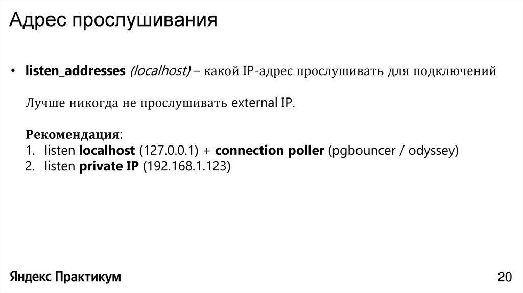 • archive_mode (off) – архивировать WALфайлы для Point-In-Time-Recovery