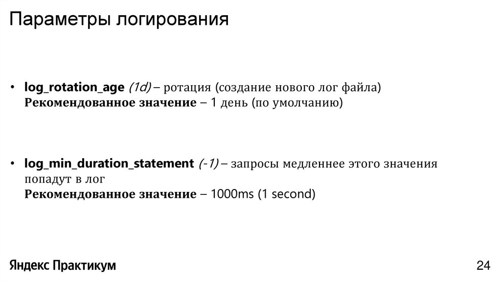 Параметры логирования• log_rotation_age (1d) – ротация (создание нового лог файла)