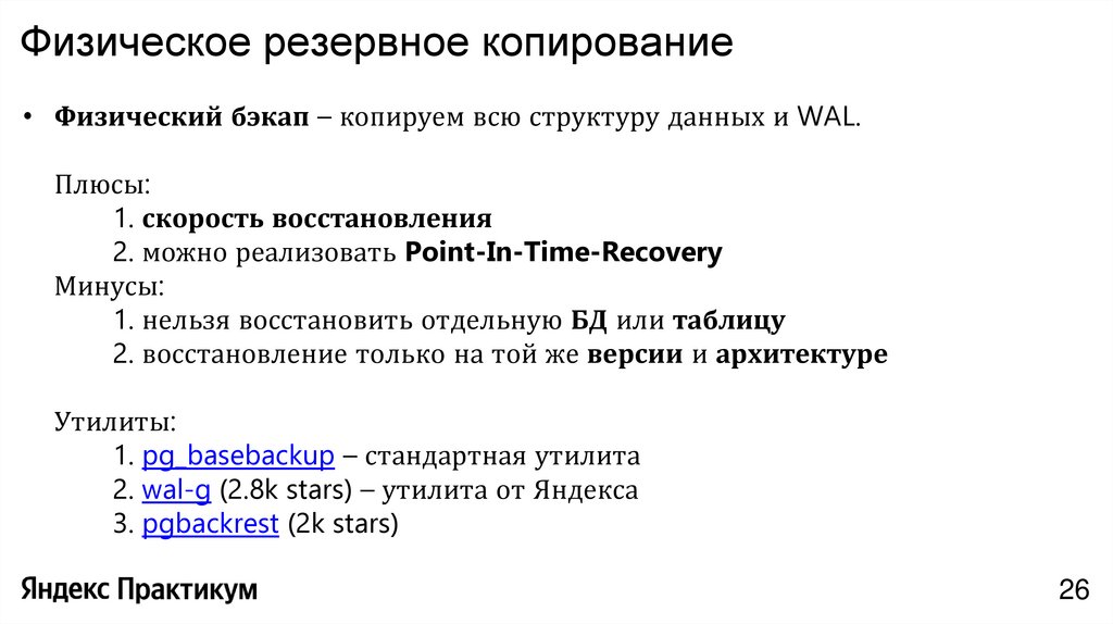 1. нельзя восстановить отдельную БД или таблицу