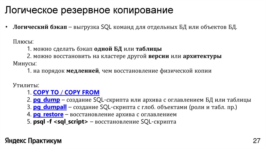 Логическое резервное копирование• Логический бэкап – выгрузка SQL команд для отдельных БД или объектов БД.
