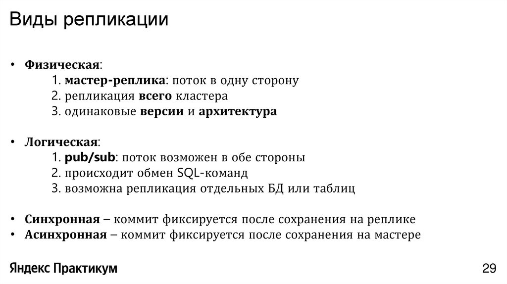 • Синхронная – коммит фиксируется после сохранения на реплике