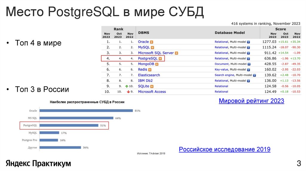 Место PostgreSQL в мире СУБД• Топ 4 в мире