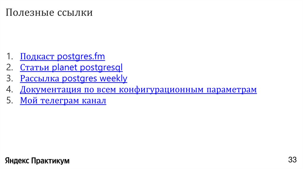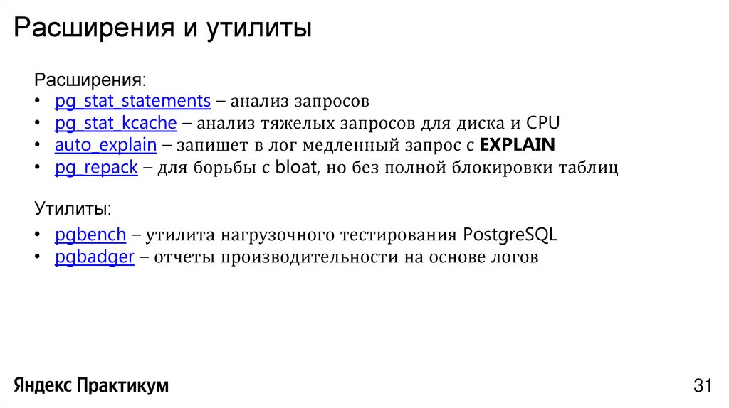 • pgbench – утилита нагрузочного тестирования PostgreSQL