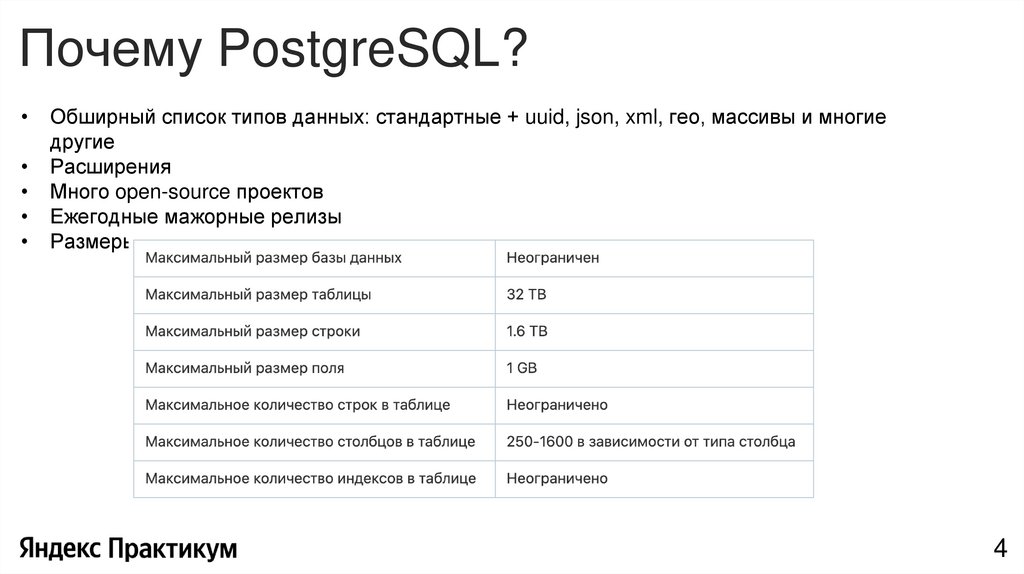 Почему PostgreSQL?Обширный список типов данных: стандартные + uuid, json, xml, гео, массивы и многие