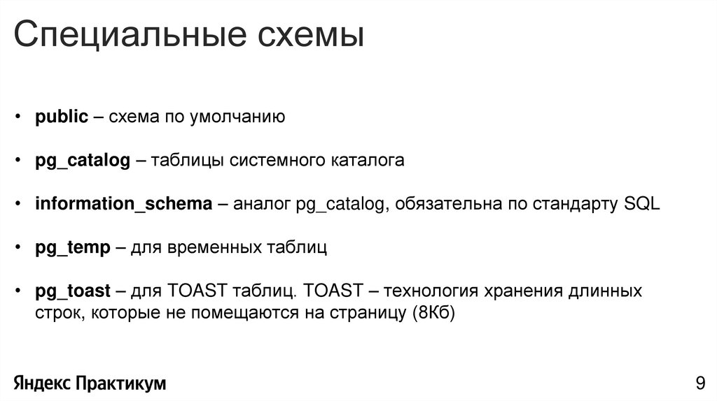 • pg_toast – для TOAST таблиц. TOAST – технология хранения длинных