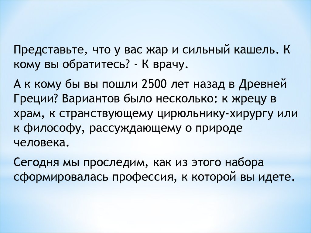 Представьте, что у вас жар и сильный кашель. Ккому вы обратитесь? - К врачу.