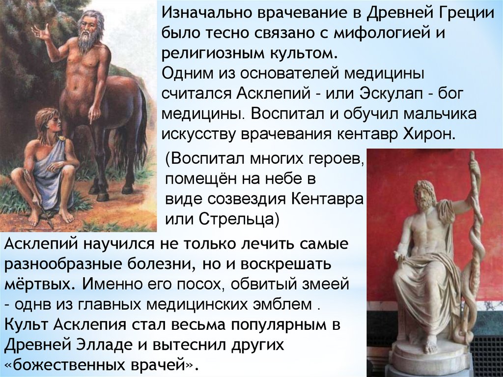 Изначально врачевание в Древней Грециибыло тесно связано с мифологией и