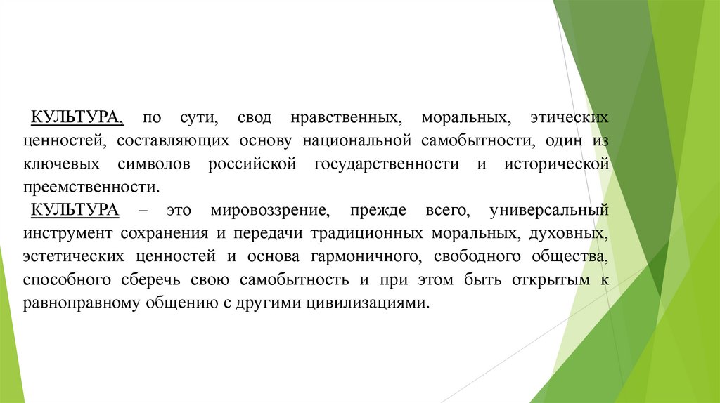 КУЛЬТУРА, по сути, свод нравственных, моральных, этическихценностей, составляющих основу национальной самобытности, один из