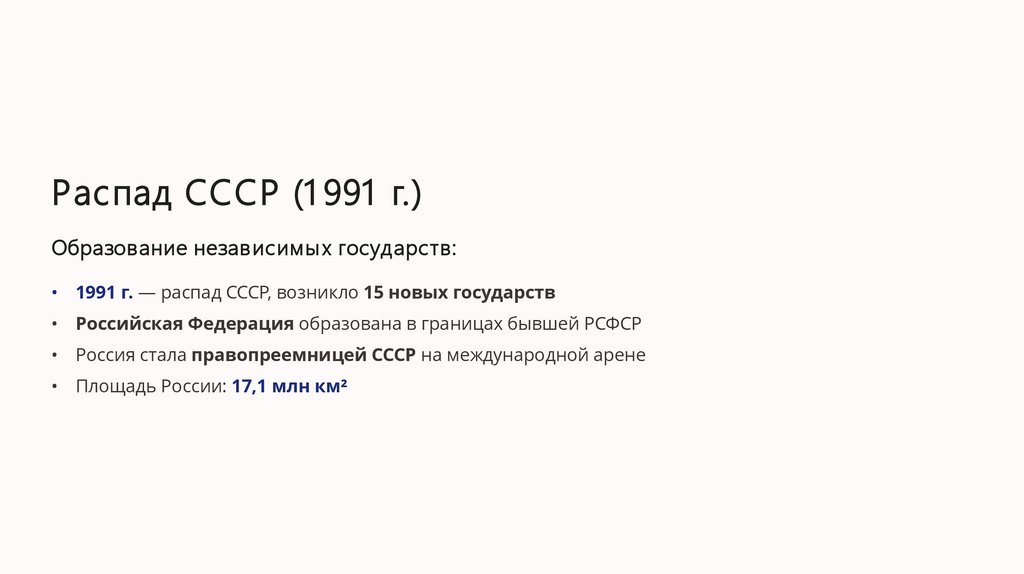 • 1991 г. — распад СССР, возникло 15 новых государств