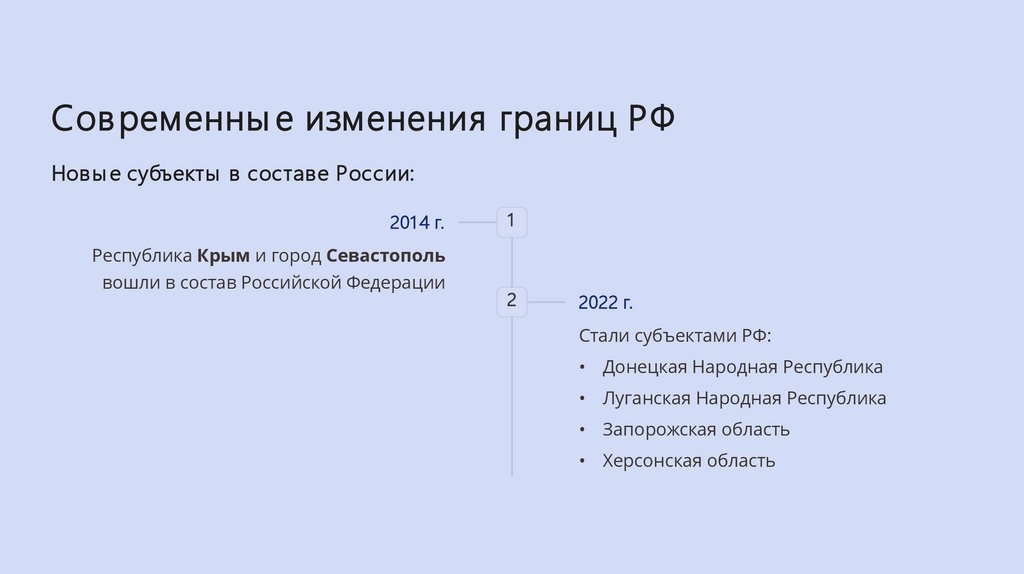 Сов ременны е изменения границ РФНов ы е субъекты в составе России: