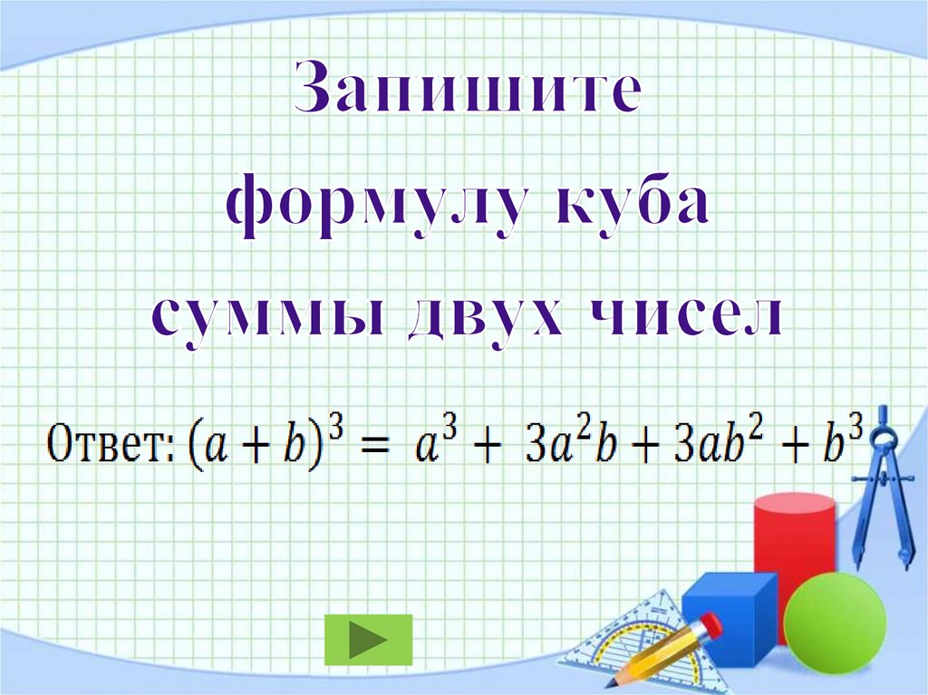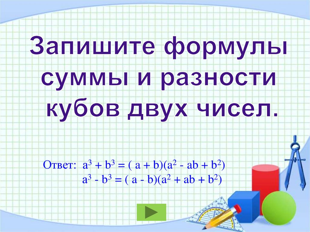 Ответ: а3 + b3 = ( a + b)(a2 - ab + b2)а3 - b3 = ( a - b)(a2 + ab + b2)