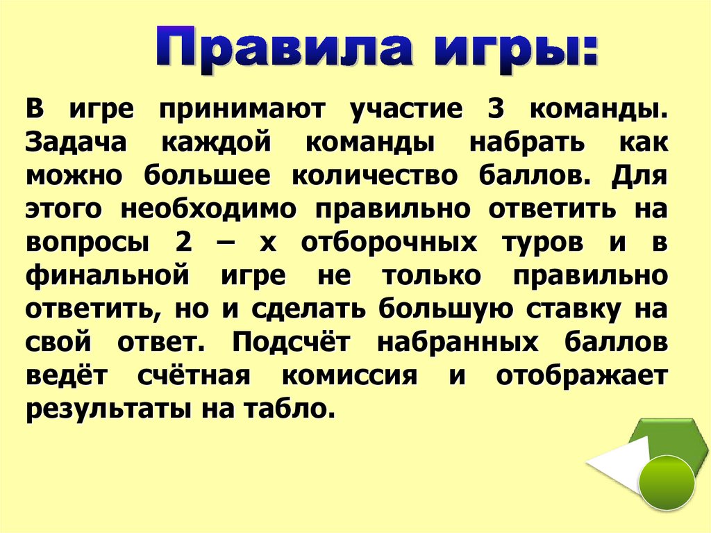 В игре принимают участие 3 команды.Задача каждой команды набрать как