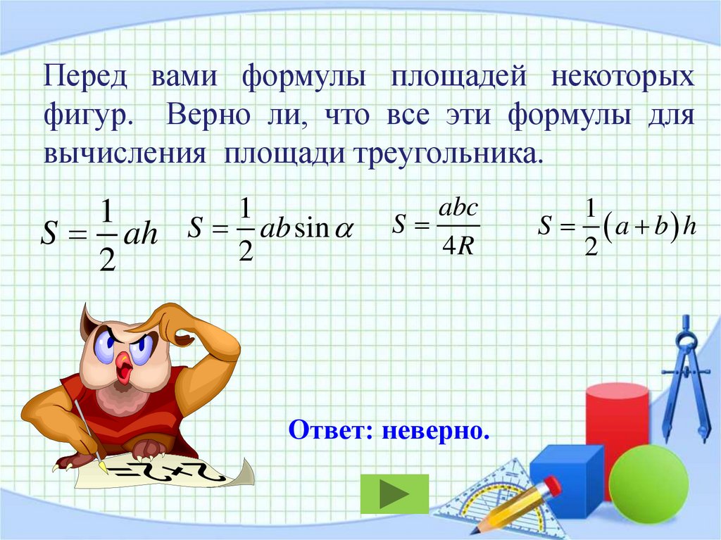 Перед вами формулы площадей некоторыхфигур. Верно ли, что все эти формулы для