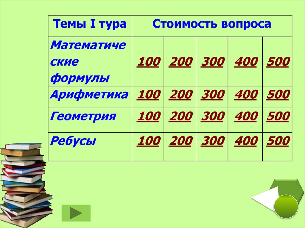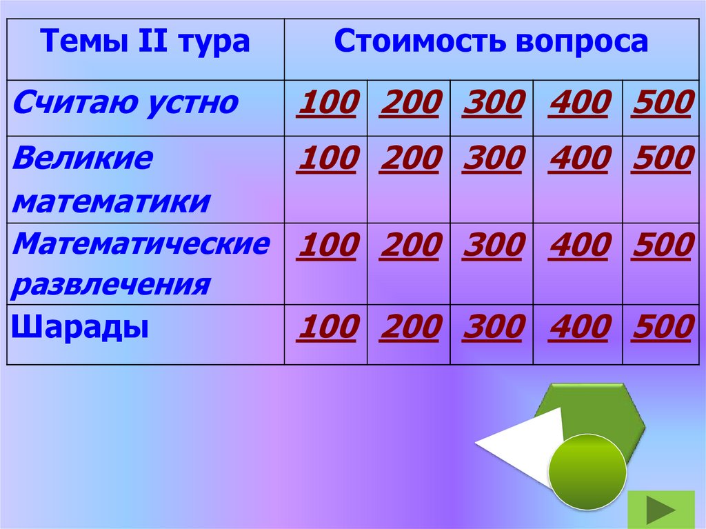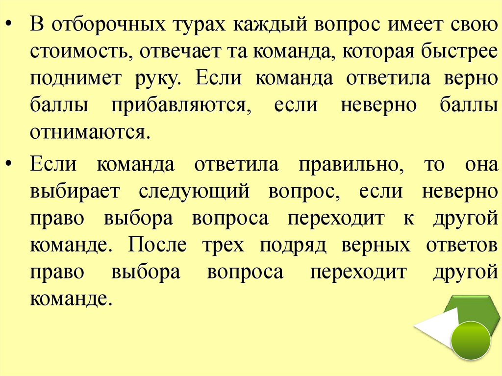 • В отборочных турах каждый вопрос имеет своюстоимость, отвечает та команда, которая быстрее