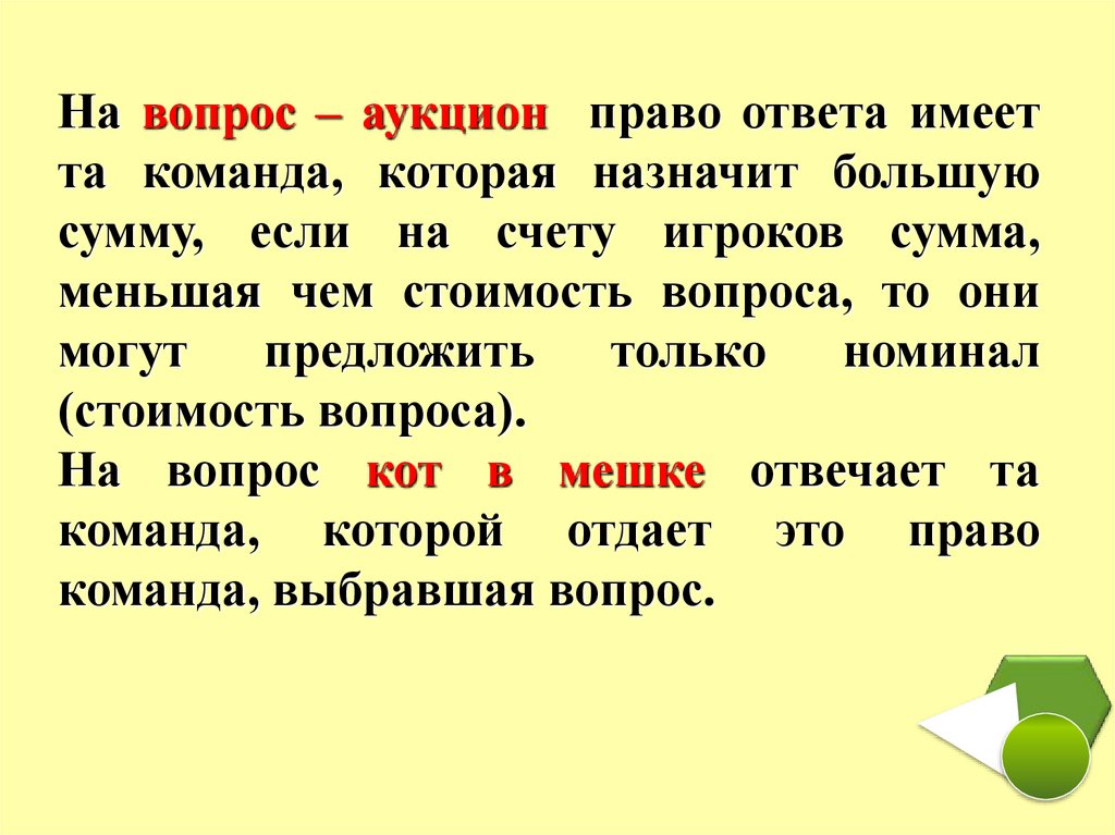 На вопрос – аукцион право ответа имеетта команда, которая назначит большую