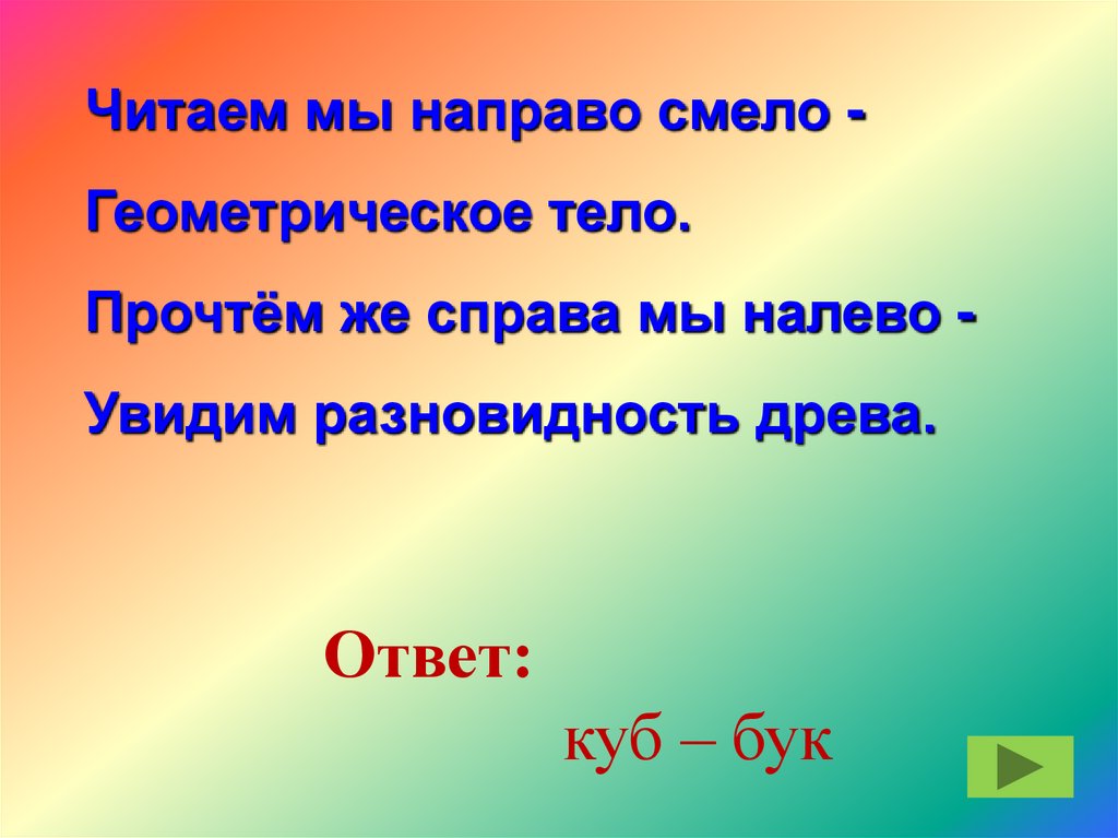 Читаем мы направо смело Геометрическое тело.Прочтём же справа мы налево Увидим разновидность древа.