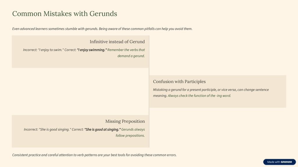 Common Mistakes with GerundsEven advanced learners sometimes stumble with gerunds. Being aware of these common pitfalls can help you avoid them.