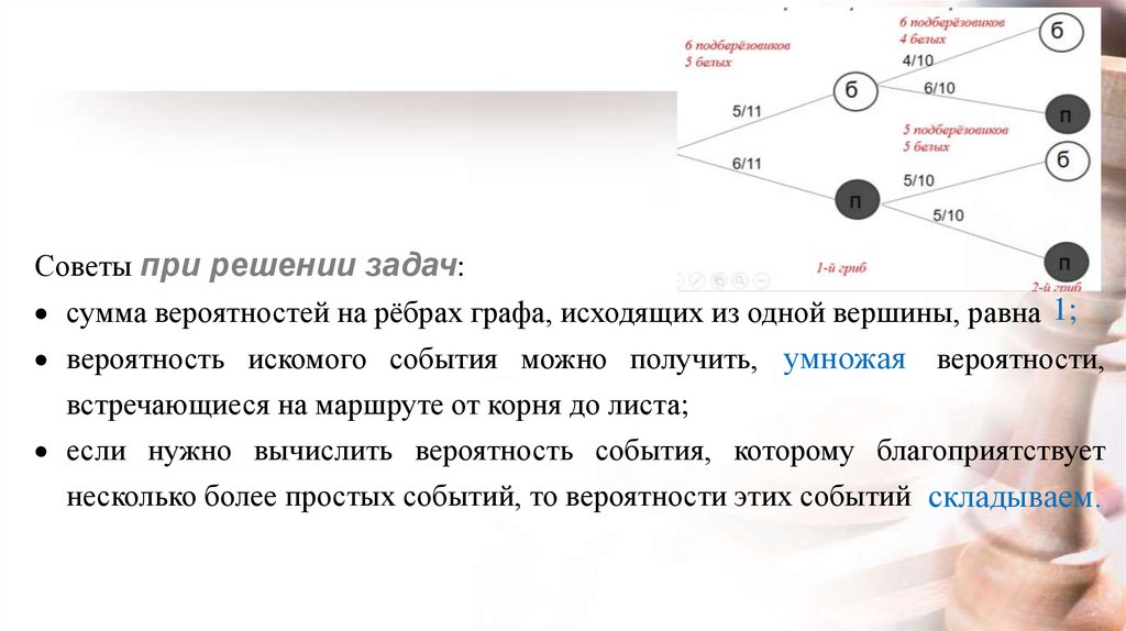 Советы при решении задач:сумма вероятностей на рёбрах графа, исходящих из одной вершины, равна 1;