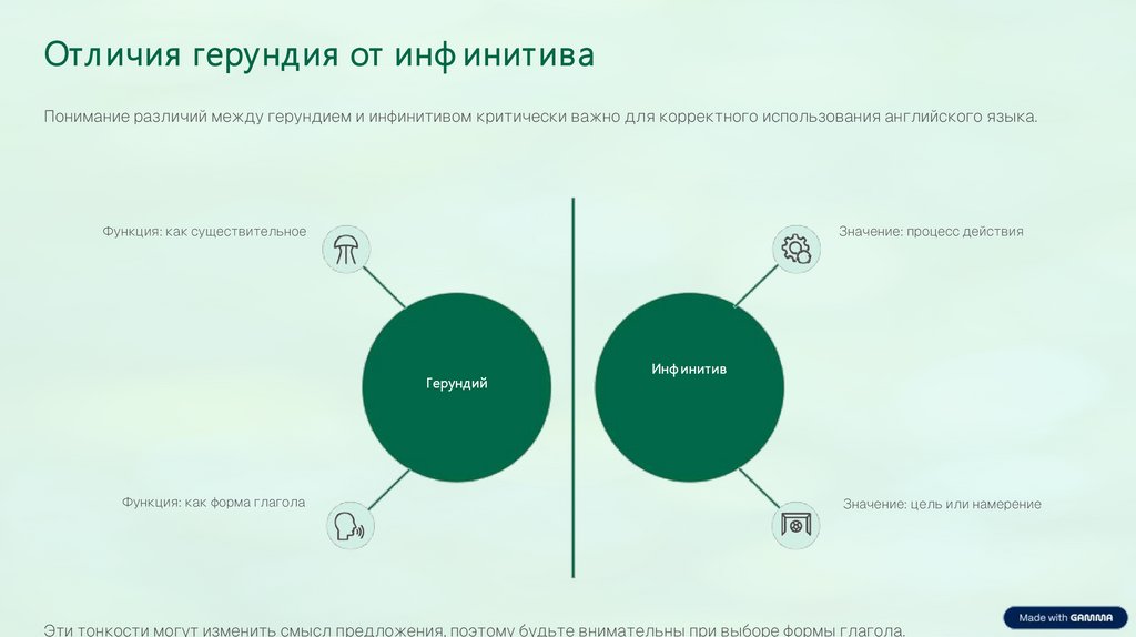 Отл ичия герундия от инф инитиваПонимание различий между герундием и инфинитивом критически важно для корректного использования английского языка.