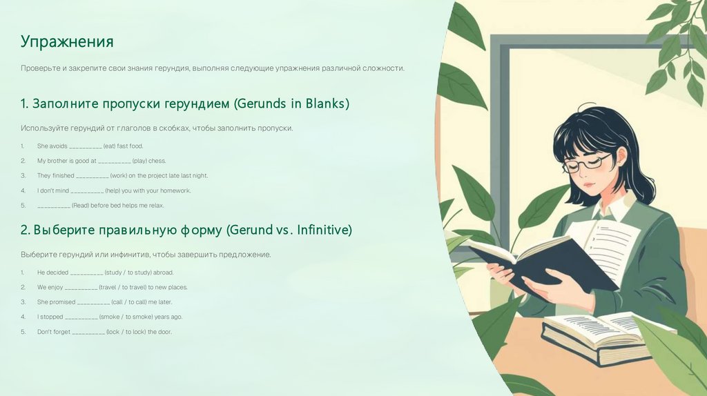УпражненияПроверьте и закрепите свои знания герундия, выполняя следующие упражнения различной сложности.